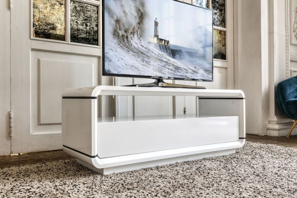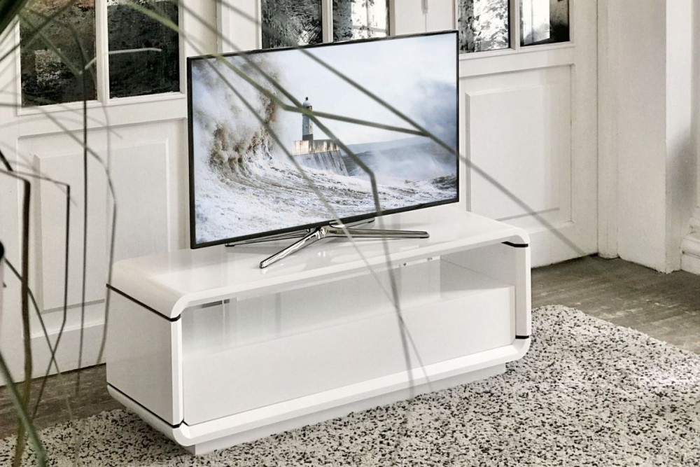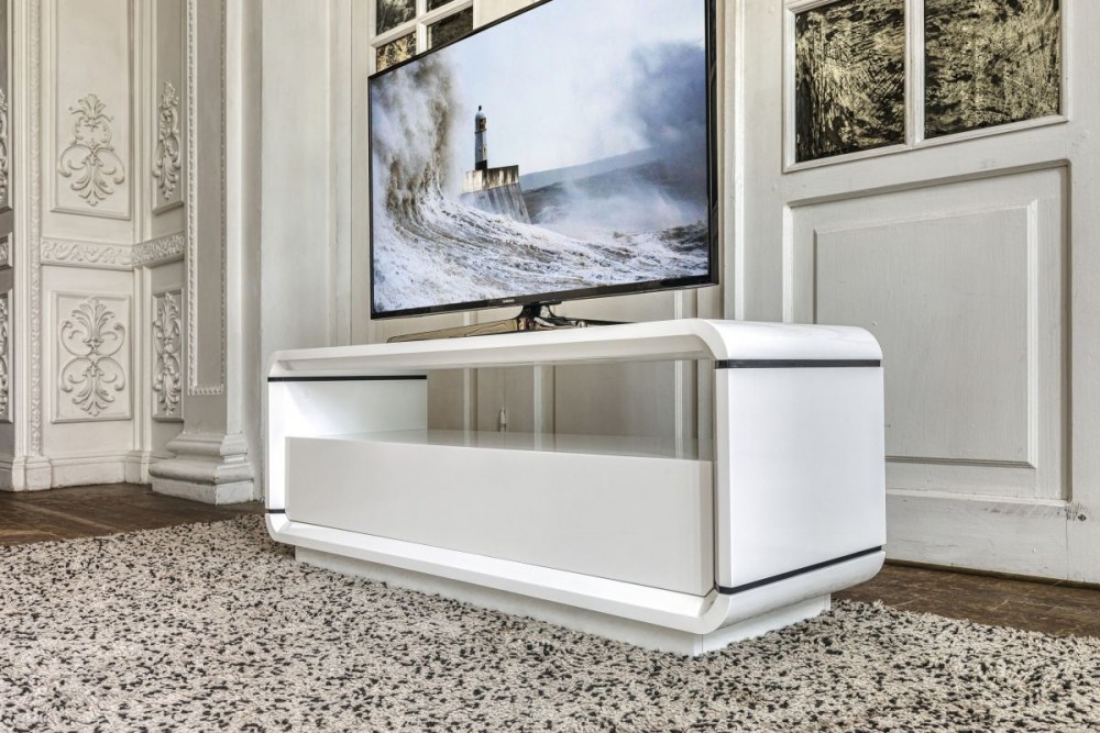 Малая напольная тв-тумба Opus Uno оригинального дизайна в стиле футуризм, минимализм. Тумба снабжена одним выдвижным ящиком и вместительной нишей под аппаратуру. Размер ниши и ящика: 1100х350хh140 мм. Габариты и конструкция тумбы позволяют устанавливать телевизоры диагональю до 50', весом до 30 кг.